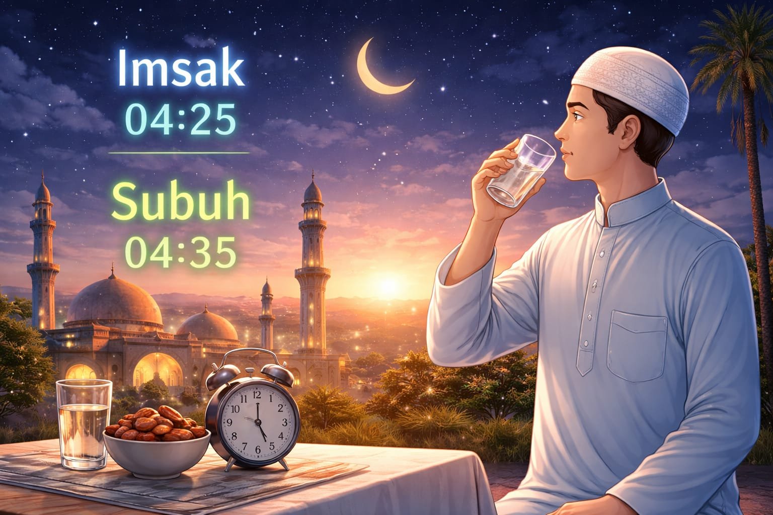 Secara bahasa, imsak berarti “menahan”. Dalam konteks jadwal Ramadan, imsak biasanya ditetapkan sekitar 10 menit sebelum waktu Subuh. Fungsinya bukan sebagai batas hukum puasa, melainkan sebagai pengingat atau bentuk kehati-hatian agar seseorang tidak terlambat berhenti makan.
